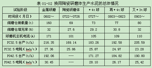 總之,¢4.2×13m聯合粉磨系統、水泥磨二倉改用陶瓷研磨體,進行的PC 32.5和PO 42.5水泥生產試驗,盡管是初步試驗,盡管臺時產量有所下降,已經取得了明顯的節電效果,初步試驗的總體情況見表01-02。