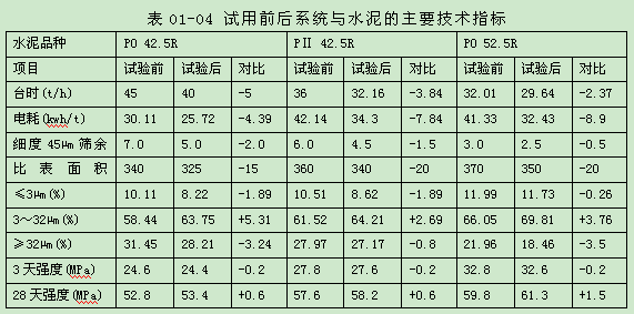 由表01-04可見,使用陶瓷研磨體后,在填充率略有提高的情況下,由于裝載重量的減少,水泥磨主電機電流由105A降至70A,水泥粉磨電耗的降低十分明顯。其中P·O42.5R降低4.39kwh/t、P·II42.5R降低7.84kwh/t、P·O52.5R降低8.9kwh/t。產能方面,盡管臺時產量有所降低,但都在10%以內,而且經過適應性調整已基本達到恢復;質量方面,在其它條件不變的情況下,各品種水泥都表現出45um篩余和比表面積同時降低、3天強度略有降低、28天強度略有上升的規律,說明減少了過粉磨現象、水泥的顆粒級配更趨合理。