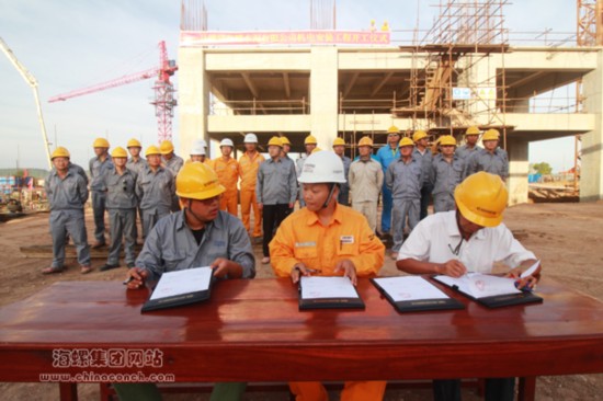 下午5時18分,馬德望海螺部分干部員工、海螺設計院、工程審計部駐廠人員、海外事業部駐廠人員、邁世紀監理公司、邯鄲中材項目部、上海寶冶項目部、北京中外運等單位參加了安裝工程開工儀式。