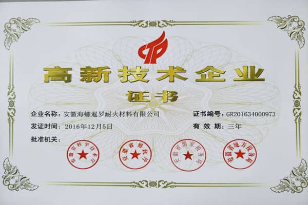 為積極爭取國家相關優惠政策、實現公司效益最大化,進一步提升企業的美譽度和市場競爭力,并以高新技術企業的申報為契機,進一步推進公司技術研發和管理創新工作、提升公司的綜合競爭力,耐火材料公司積極開展高新技術企業申報工作,于2016年12月順利通過國家高新技術企業認定,并于2017年元月取得高新技術企業證書,成為安徽省2016年第二批高新技術企業,這是耐火材料發展史上的又一里程碑。