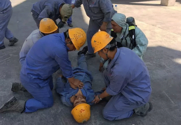熟料分廠廠長宋杰明擔任本次應急救援演練總指揮,并由救護組、搶險組、警戒組、現場清理組和后勤保障組構成演練框架。演練模擬一名職工巡檢時發現6#氨水罐區因發生氨水泄漏導致一人暈倒在地。因情況未明,立即用對講機向生產值班長報告,接到報告后,值班長迅速趕往事故現場,由于氨水氣味較濃,無法近距離查看,初步判斷為現場發生氨水泄漏。并立即向分廠匯報:宋廠長,6#氨水罐區發生氨水泄漏,有一名員工暈倒,因氣味較濃,無法進入施救,請指示。宋廠長接到報告后,一邊趕往事故現場,一邊通知分廠安全員迅速啟動應急預案組織實施緊急救援。接到通知的各應急小組快速在6#窯三檔東側集合,并在總指揮的統一調度指揮下迅速展開人員疏散、搶救傷員、現場警戒、堵漏搶險、消防救援等應急措施。整個演練過程緊張有序,各小組行動迅速,對問題處理果斷。最后,現場清理組組長白海兵向總指揮報告:總指揮,已對泄漏氨水進行了回收,地面殘留氨水已用消防水進行了稀釋中和處置,隱患已消除,請指示。總指揮:返回原地待命。總指揮接到各小組組長完成救援報告后,命令各小組組長清點各自人數。至此,本次應急救援任務圓滿完成。