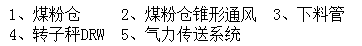 靠一套通氣系統(2)支持,煤粉從煤粉倉(1)流出,轉子秤(4)將煤粉進行定量喂料,傳送空氣(5)從風機中出來,并將煤粉直接吹到燃燒器。轉子秤喂料的高精度確保燃燒器中穩定的空氣/煤粉混合。使用一個下料管(3)將煤粉倉出口與轉子秤(4)相連。