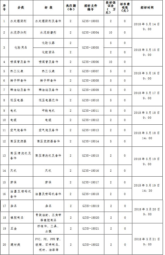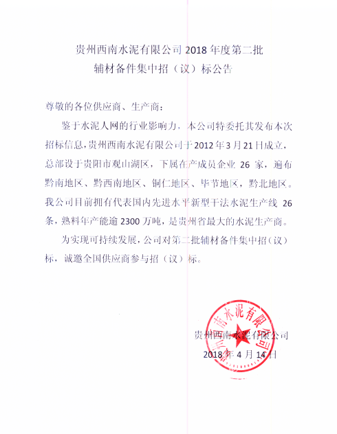 貴州西南水泥有限公司是西南水泥有限公司下屬子公司,于2012年3月21日成立。貴州西南水擬定于2018年5月中旬對下屬26家成員企業2018年度輔材備件進行集中招標,通過邀請招標(議價)選擇資質合格、保供能力強、質量及技術服務均受控的供貨單位。現將相關招標采購信息發布如下: