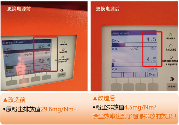 煤山南方水泥本次技改中,除塵器本體檢修和改造,是利用停窯檢修期間完成的。為驗證智能變頻脈沖電源的除塵效率,除塵電源是在生產期間進行不停窯更換的,更換前在線監測顯示粉塵排放為29.6 mg/Nm3,更換完成后,監測儀顯示粉塵排放很快降低至4.5 mg/Nm3左右,除塵效果顯著且直觀真實!