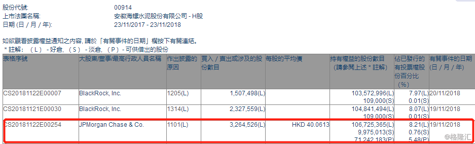 格隆匯獲悉,根據港交所最新權益披露資料顯示,2018年11月19日,海螺水泥獲JP Morgan Chase & Co.場內以每股均價40.0613港元,增持326.45萬股,總價約1.31億港元。