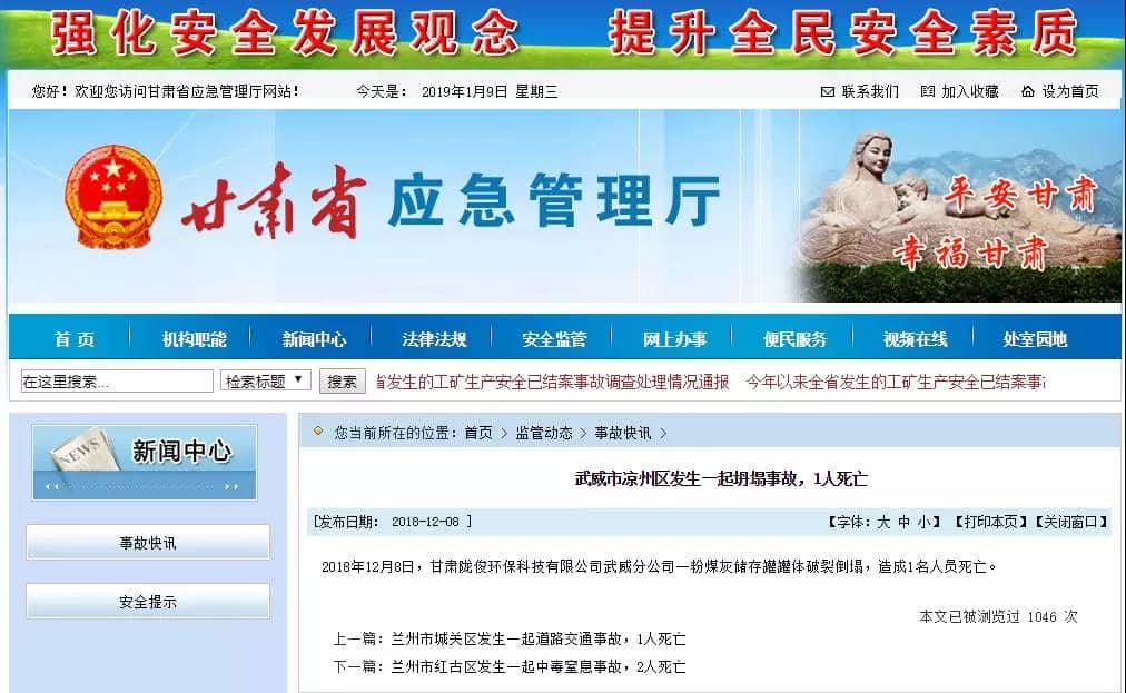 甘肅省安監局消息:12月18日甘肅隴俊環保科技有限公司武威分公司一粉煤灰倉儲罐體發生破裂倒塌,造成工作人員被埋,事故導致1人死亡。