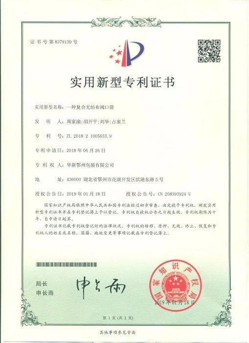 近日,華新包裝公司研制的“一種復(fù)合無紡布閥口袋”獲得了國家知識(shí)產(chǎn)權(quán)局頒發(fā)的實(shí)用新型專利證書,專利期限為10年,這是該公司獲得的第十項(xiàng)專利。