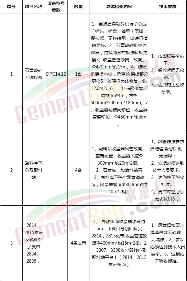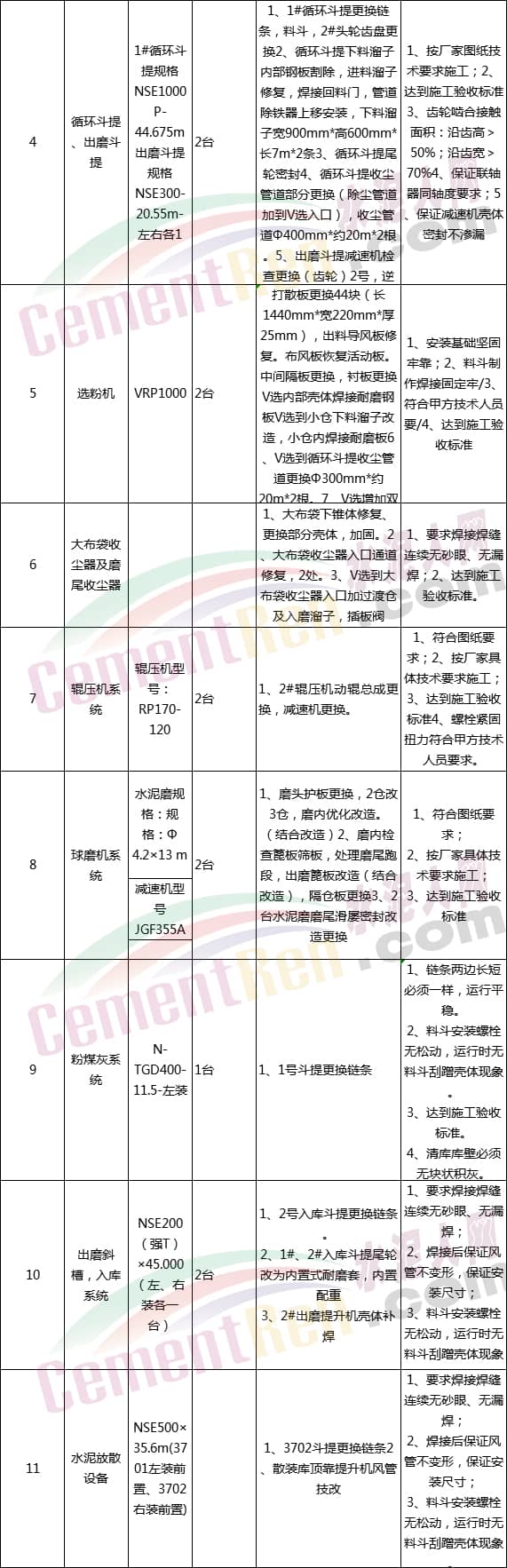 第一標(biāo)段:水泥分廠設(shè)備大修,具體內(nèi)容見下表: