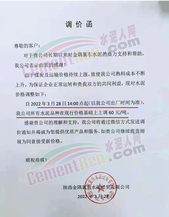 水泥人網通訊員消息:3月28日,陜西金隅冀東水泥經貿有限公司通知,當日14時起各品種水泥上調60元/噸,冀東海德堡(涇陽)水泥有限公司同步上調60元/噸。