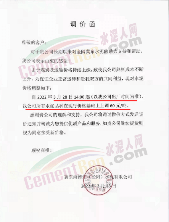 天津山水水泥有限公司調價函稱,近期受疫情、錯峰生產、油價上漲等多方面因素持續影響,原材料及運輸成本大幅上漲,水泥制造成本激增。為保障公司正常生產運行,繼續為客戶提供優質產品及服務,經廠家決定水泥價格自3月28日上午8時起P.O42.5散裝水泥上調60元/噸。