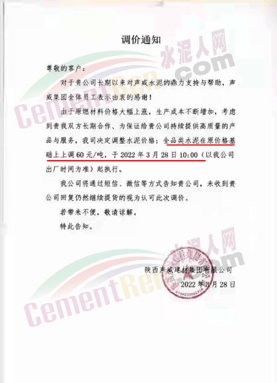 蒲城堯柏特種水泥通知,3月28日12時起,所有型號水泥上漲60元/噸。