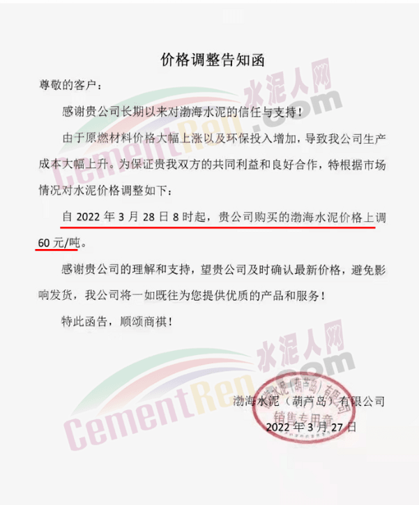 渤海水泥(葫蘆島)有限公司通知,3月28日8時起,渤海水泥價格上調60元/噸。