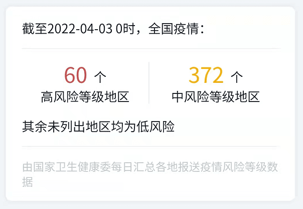 近期,全國疫情呈現(xiàn)局部高度聚集和多點(diǎn)散發(fā)態(tài)勢,截止4月3日0時(shí),全國共有高風(fēng)險(xiǎn)等級地區(qū)60個(gè),中風(fēng)險(xiǎn)等級地區(qū)372個(gè)。