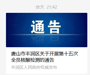 河北唐山豐潤區(qū)政府4月1日晚21時(shí)42分發(fā)布通告稱,根據(jù)當(dāng)前疫情防控形勢,定于2022年4月2日13點(diǎn),對豐潤區(qū)域內(nèi)所有居民(含外來人員)開展第十五次全員核酸檢測。