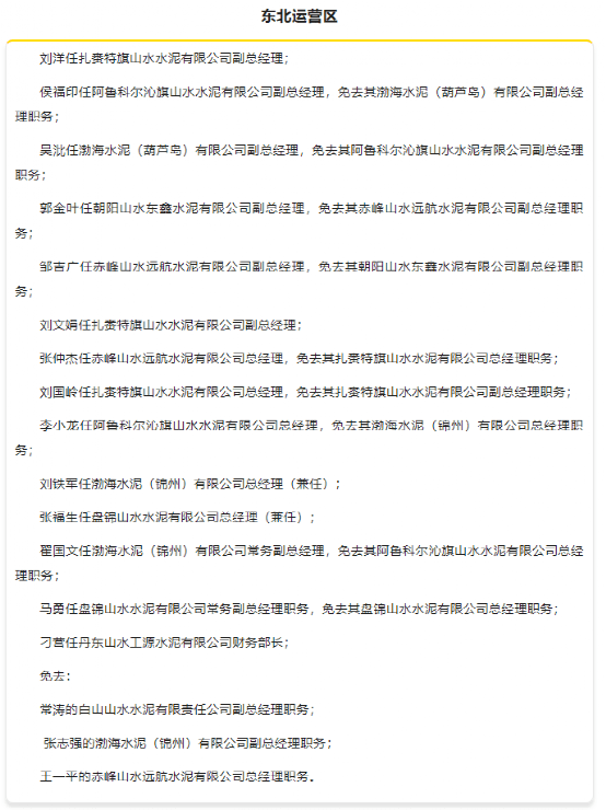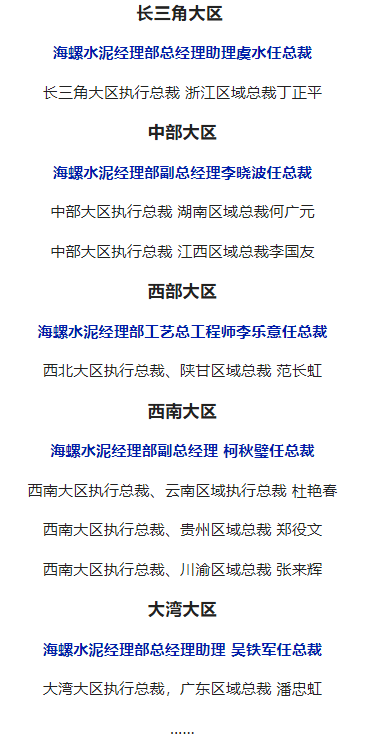 2022年元月海螺水泥原區域主任改為執行總裁,并由總部公司經理部管理層領導兼任大區總裁。