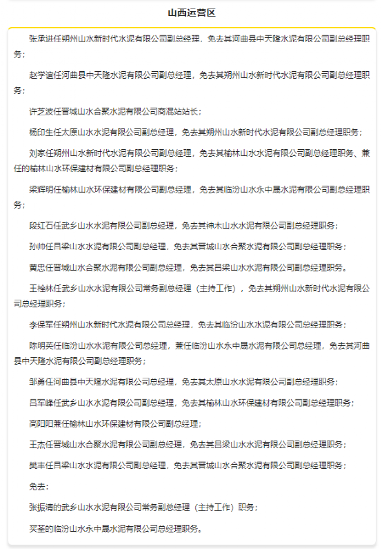 1月中旬,山東山水集團有限公司發布人事任命,對旗下多個運營區進行人事調整,涉及魯西、魯東、魯南、東北和山西等多個區域。