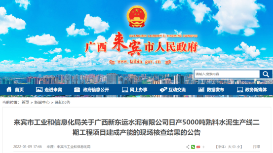 日前廣西來賓市工業和信息化局發布公告稱,已于2022年3月1日,組織廣西水泥行業協會專家組到廣西新東運水泥有限公司已建成的5000t/d熟料水泥生產線二期工程項目產能進行現場核實并出具了核查一致結果公告。
