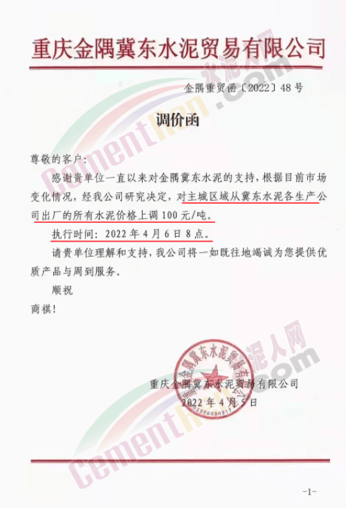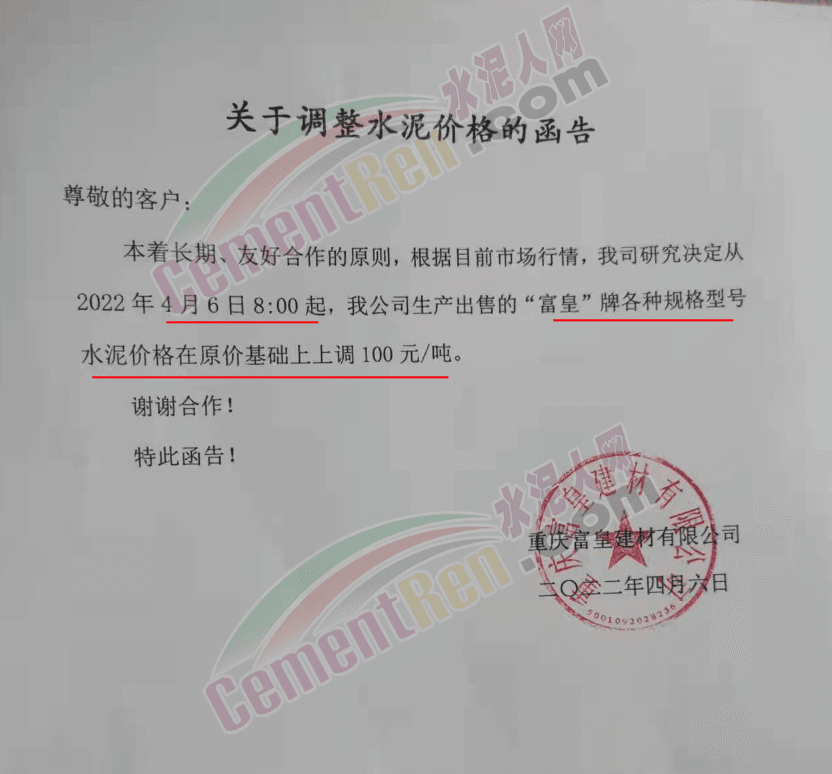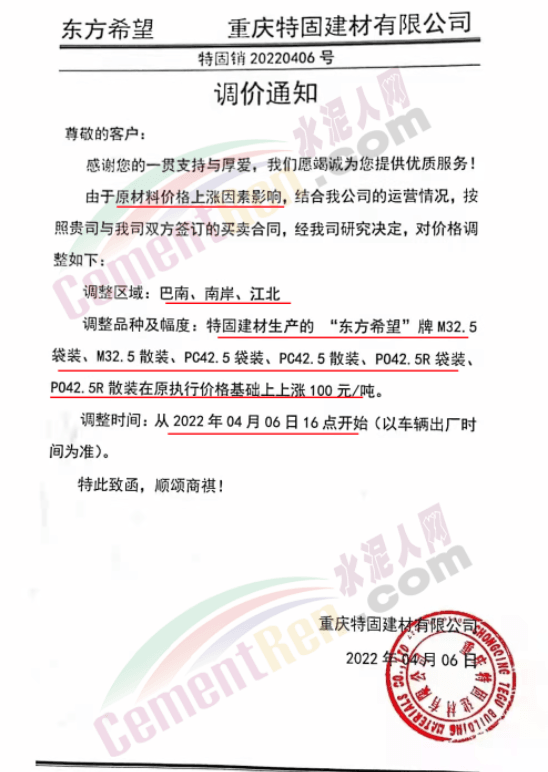 四川億鑫聯水泥有限公司通知,根據當前市場行情原材料成本上漲等情況,經公司研究決定自4月6日上午7時起,對各型號水泥在原價基礎上上調100元/噸。