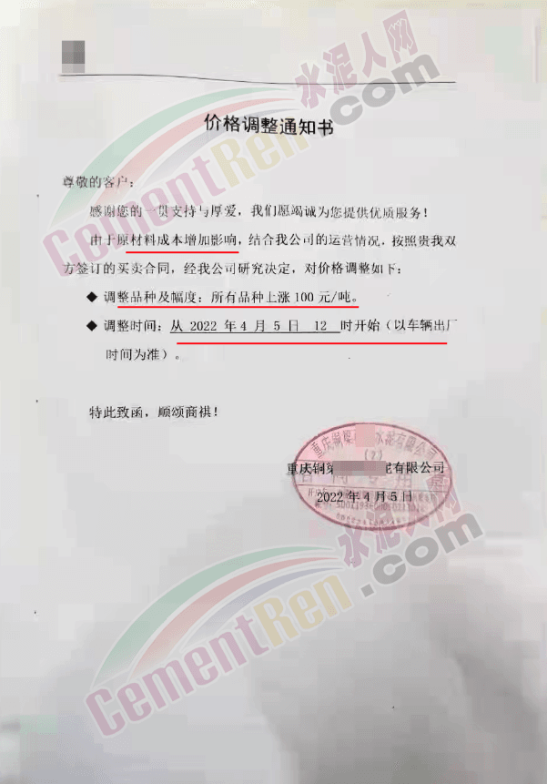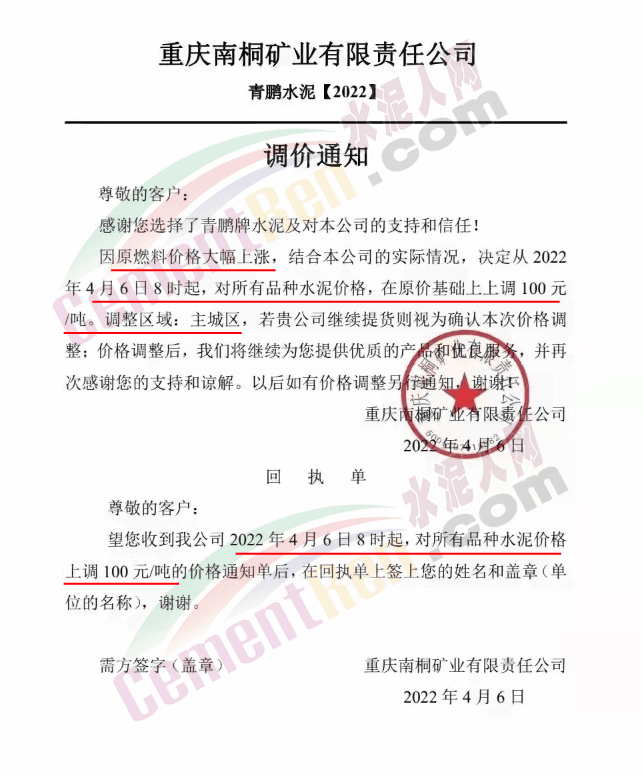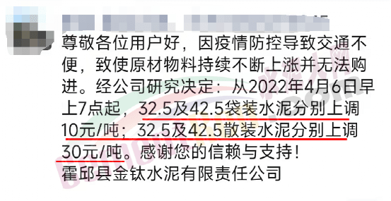 安徽六安霍邱縣金鈦水泥有限責任公司發通知稱,因疫情防控導致交通不便,致使原材物料持續不斷上漲并無法購進。經公司研究決定從2022年4月6日早上7點起,32.5及42.5袋裝水泥分別上調10元/噸;32.5及42.5散裝水泥分別上調30元/噸。