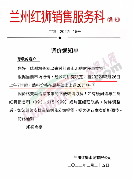 蘭州紅獅銷售服務科通知。根據當前市場行情,經公司研究決定,自2022年4月2日上午7時起,熟料價格在原基礎上上調20元/噸。據了解,這是蘭州紅獅近一個月來的第二次熟料調價,企業還曾于3月26日上調熟料價格20元/噸,兩次調價累計上調40元/噸。