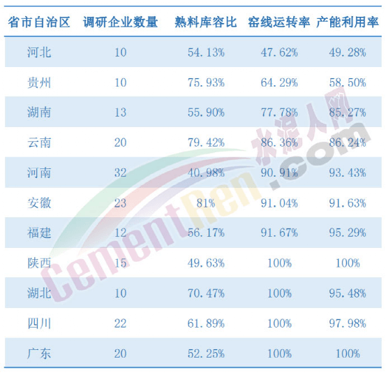 部分區域熟料庫容比及產能利用率一覽