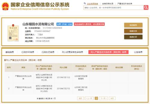 以山東榴園水泥有限公司為例,企業在2018年7月27日被山東省工商行政管理局列入嚴重違法失信企業名單,列入原因為被列入經營異常名錄屆滿3年仍未履行相關義務。2019年7月11日再次被山東省市場監督管理局列入嚴重違法失信企業名單,列入原因仍為被列入經營異常名錄屆滿3年仍未履行相關義務。
