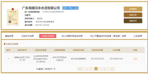 據查詢,上述企業中的廣東海螺鴻豐水泥有限公司為海螺水泥2021年11月剛剛接手控股的企業,其行政處罰發生在2021年9月14日,違法類型為企業使用未獲得特種作業操作證的人員上崗作業。