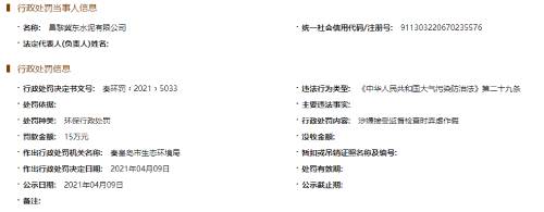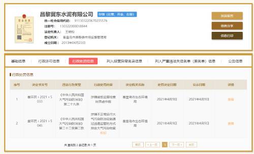 昌黎冀東水泥有限公司因涉嫌不正常運行大氣污染防治設施通過逃避監管的方式排放大氣污染物,涉嫌接受監督檢查時弄虛作假,在2021年4月9日被秦皇島市生態環境局處罰。