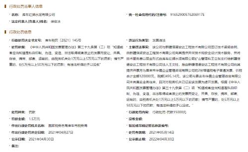 庫車紅獅水泥有限公司因發票違法被國家稅務總局庫車市稅務局于2021年4月27日處罰1500元。主要違法事實為“虛開發票”。