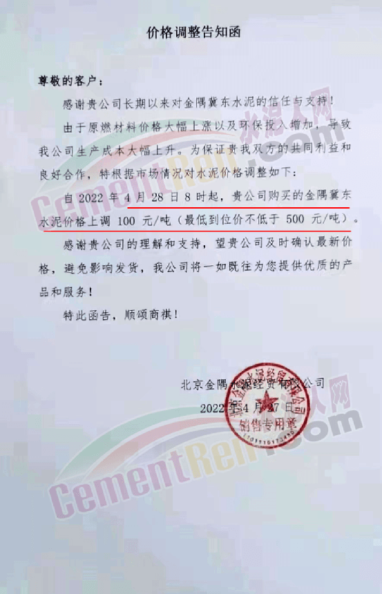 云南永保特種水泥有限責任公司通知,因各類水泥原材料的緊缺及價格上漲而導致生產成本的上升,故對水泥價格做出調整以緩解不斷上漲的成本壓力,自2022年4月30日0時起所有區域所有品種水泥在原價基礎上上調 30元/噸。