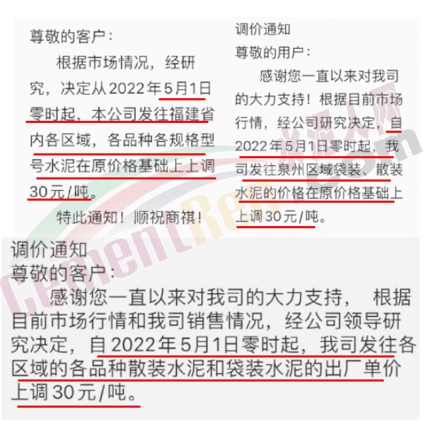 同期,福建區(qū)域多家企業(yè)通知福建省全區(qū)域“普漲30元/噸”,企業(yè)漲價(jià)通知函稱(chēng),由于燃煤、用電價(jià)格上漲,加之運(yùn)輸費(fèi)用漲幅明顯,水泥生產(chǎn)經(jīng)營(yíng)成本增加,為轉(zhuǎn)移成本壓力,提升盈利,決定上調(diào)水泥價(jià)格。