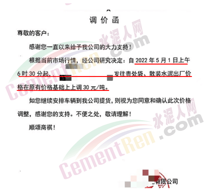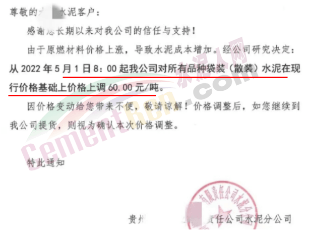 貴州部分水泥企業(yè)通知由于原燃材料價(jià)格上漲,經(jīng)公司研究決定從5月1日8時(shí)起上調(diào)水泥價(jià)格60元/噸。