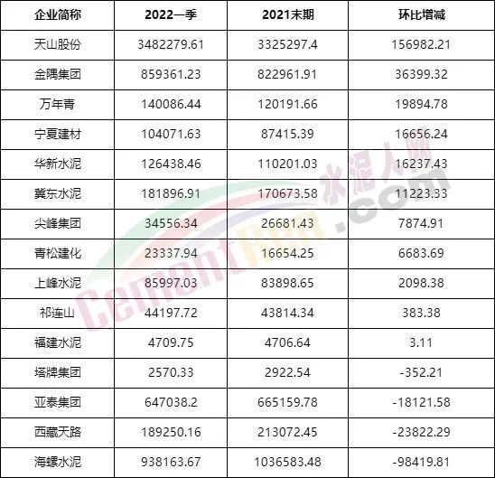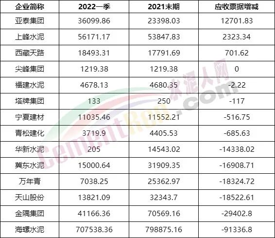 應(yīng)收賬款及票據(jù)方面,天山股份、金隅集團、萬年青、寧夏建材、華新水泥、冀東水泥、尖峰集團、青松建化、上峰水泥、祁連山、福建水泥等企業(yè)2022年一季度較上看末期環(huán)比均有不同幅度的增加。