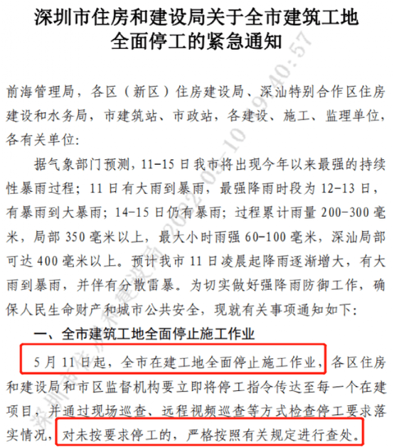 深圳市住建局發布了關于全市建筑工地全面停工的緊急通知要求5月11日起,全市在建工地全面停止施工作業,各區住房和建設局和市區監督機構要立即將停工指令傳達至每一個在建項目,并通過現場巡查、遠程視頻巡查等方式檢查停工要求落實情況,對未按要求停工的,嚴格按照有關規定進行查處。