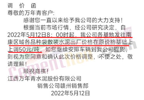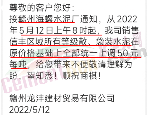 5月10日弋陽海螺水泥、江西萬年青,對(duì)上饒所有袋散水泥價(jià)格上調(diào)50元/噸。