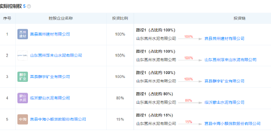 企業對外投資五家企業,其中莒縣麒宇礦業有限公司、莒縣中海小額貸款股份有限公司、山東莒州浮來山水泥有限公司、莒縣建材有限公司四家尚在正常營業。企業對莒縣麒宇礦業有限公司、山東莒州浮來山水泥有限公司、莒縣建材有限公司為100%控股,莒縣中海小額貸款股份有限公司持股15%。