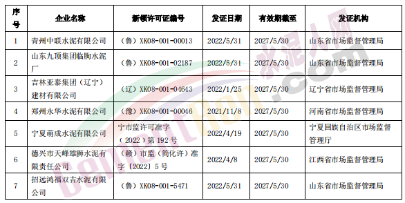 據水泥人網了解,上述到期許可證部分已經在省級市場監管部門換發了新的生產許可證,另有部分企業表示等到許可證到期前一兩個月再申領新證。以5月30日到期的19個編號生產許可證為例,已經有7家企業在生產許可證到期前從相應省和自治區市場監管局申領了新版生產許可證。