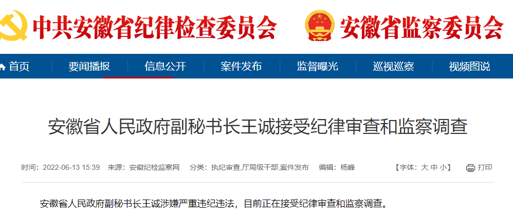 據(jù)安徽省紀(jì)委監(jiān)委消息:安徽省人民政府副秘書長王誠涉嫌嚴(yán)重違紀(jì)違法,目前正在接受紀(jì)律審查和監(jiān)察調(diào)查。