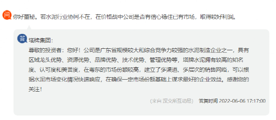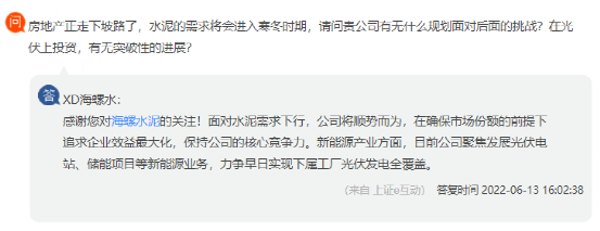 日前,有投資者在市公司平臺(tái)提問(wèn),房地產(chǎn)正走下坡路了,水泥的需求將會(huì)進(jìn)入寒冬時(shí)期,請(qǐng)問(wèn)貴公司有無(wú)什么規(guī)劃面對(duì)后面的挑戰(zhàn)?
