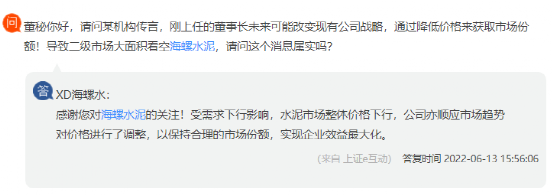 另有投資者提問(wèn),剛上任的董事長(zhǎng)未來(lái)可能改變公司現(xiàn)有戰(zhàn)略,企業(yè)通過(guò)降低價(jià)格來(lái)獲取市場(chǎng)份額,導(dǎo)致二級(jí)市場(chǎng)大面積看空海螺水泥,是否屬實(shí)?