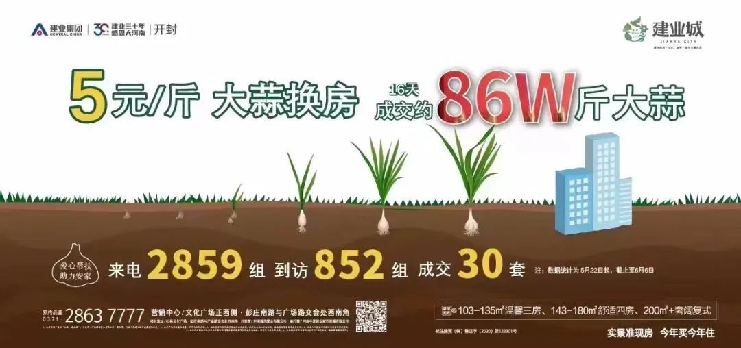 河南商丘民權縣建業地產的一個樓盤就以 “愛心助農”的口號,高價收高小麥抵首付,2元/斤,最高可抵 16萬房款。建業地產在河南開封杞縣還推出了大蒜抵房款。