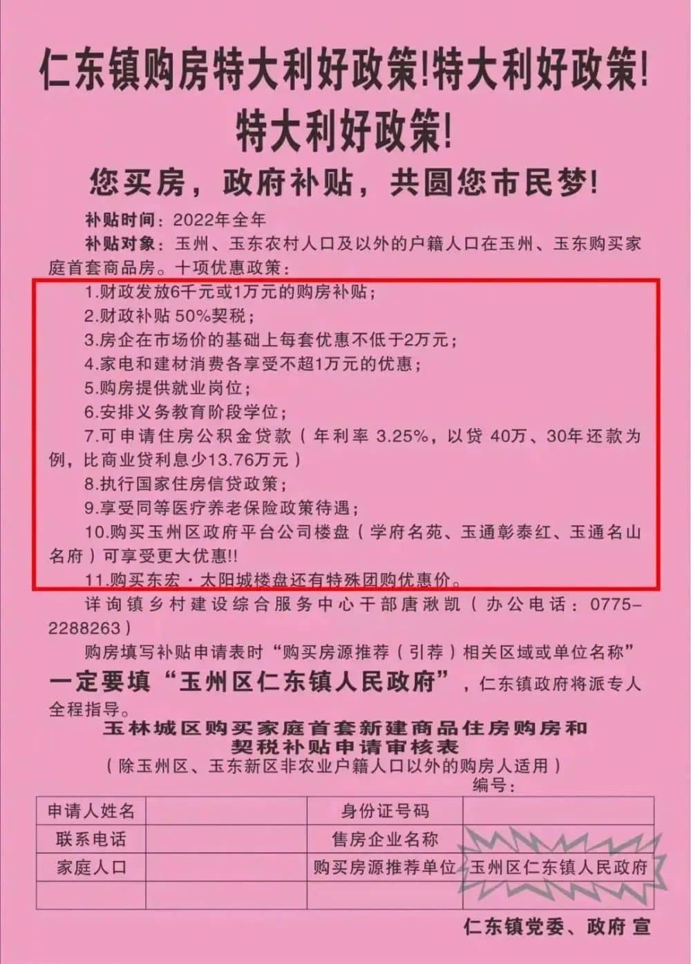 玉林市玉州區仁東鎮黨委、政府發購房特大利好政策。購房填寫補貼申請表時“購買房源推薦(引薦)相關區域或單位名稱”一定要填“玉州區仁東鎮人民政府”,仁東鎮政府將派專人全程指導。