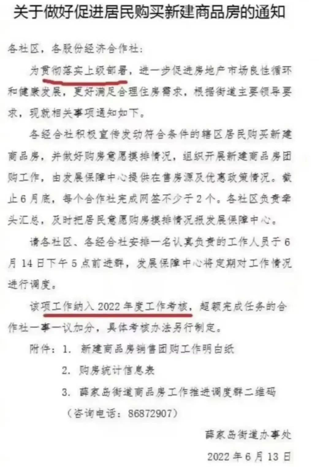 山東青島把賣房納入了工作人員考核范圍之內,比如青島市西海岸新區某街道辦事處一則名為《關于做好促進居民購買新建商品房的通知》廣為流傳。通知要求各社區、各股份經濟合作社,發動轄區居民購買新建商品房,組織新建商品房團購,至6月底每個合作社完成網簽不少于2個,并將該項工作納入2022年度工作考核。對此社區工作人員表示,“完不成的話,我們社區是要扣分的,社區書記也是有可能要被扣錢的。”