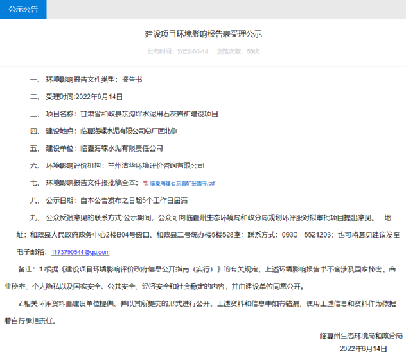 據水泥人網了解,2022年6月14日甘肅省臨夏州生態環境局和政分局發布《建設項目環境影響報告表受理公示》。公示建設項目為臨夏海螺水泥有限公司總廠西北側甘肅省和政縣東溝坪水泥用石灰巖礦建設項目。