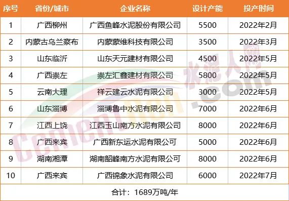 據水泥人網不完全統計,今年內共投產水泥熟料產線10條,合計熟料產能1689萬噸。僅廣西區域就有4條水泥熟料生產線,熟料產能合計達669萬噸/年。