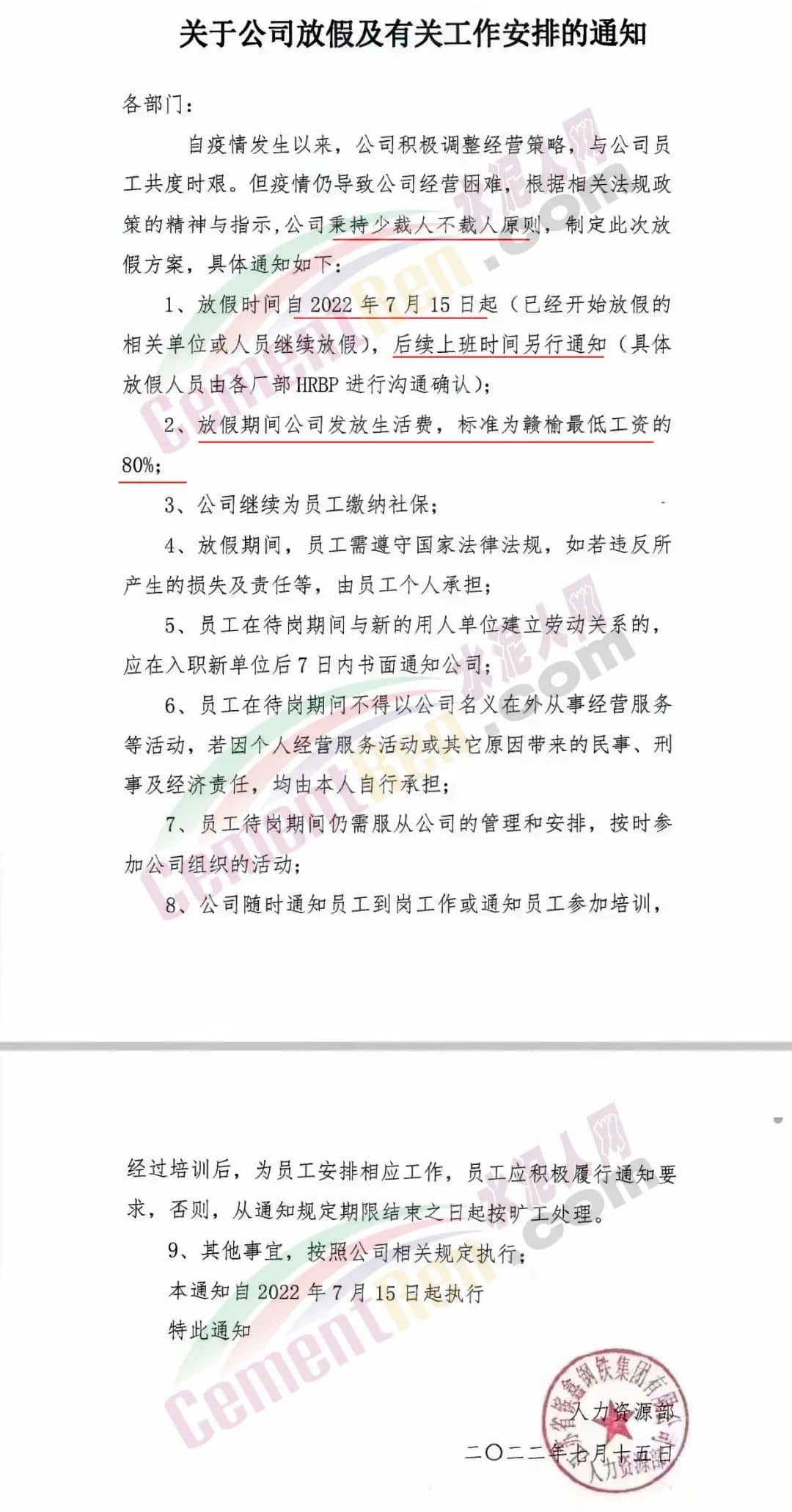 日前,江蘇一家鋼鐵公司發(fā)放假通知稱,自疫情發(fā)生以來,公司積極調(diào)整經(jīng)營策略,與公司員工共度時艱。但疫情仍導致公司經(jīng)營困難,根據(jù)相關(guān)法規(guī)政策的精神與指示,公司秉持少裁人不裁人原則,制定放假方案。放假時間自2022年7月15日起,后續(xù)上班時間另行通知;放假期間公司發(fā)放生活費,標準為贛榆最低工資的80%……