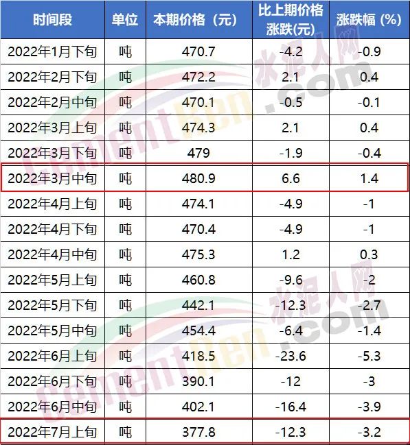 國家統計局流通領域價格信息顯示,P.O 42.5散裝水泥2022年3月中旬報480.9元/噸為上半年最高價,2022年7月上旬報377.8元/噸,為相對較低價,高價與低價相差100元/噸以上。