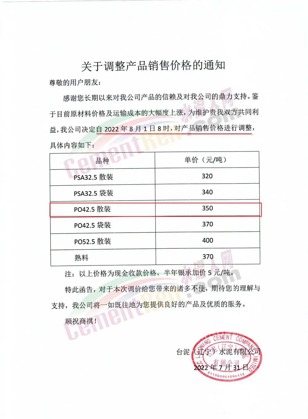 臺泥(遼寧)水泥有限公司通知稱,自8月1日8時起對產品銷售價格進行調整,調整后P.O42.5散裝水泥報價350元/噸。
