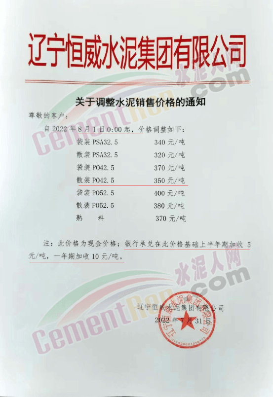 遼寧恒威水泥集團有限公司通知,自8月1日起調整水泥報價,調整后P.O42.5散裝水泥報350元/噸。