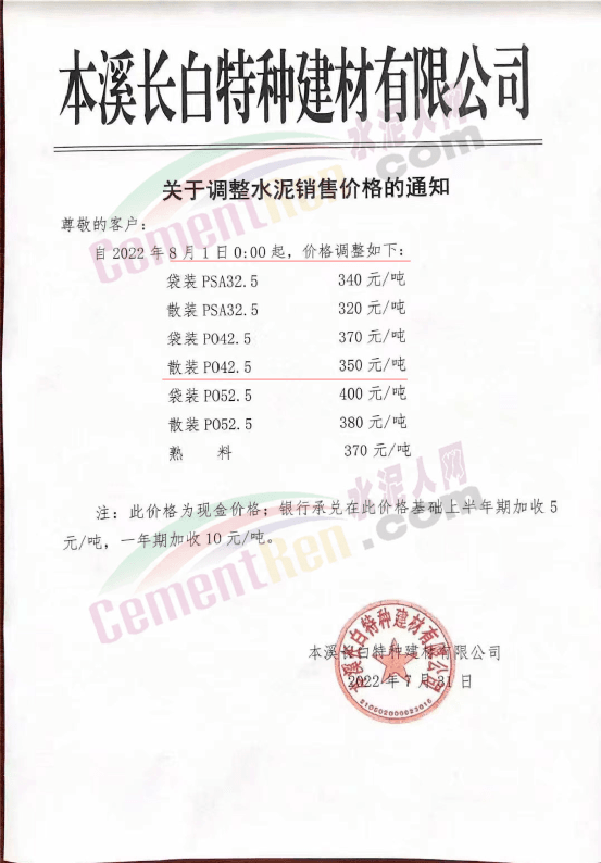 本溪長白特種建材有限公司通知自8月1日起調整水泥價格,調整后散裝P.O42.5散裝水泥報價350元/噸。